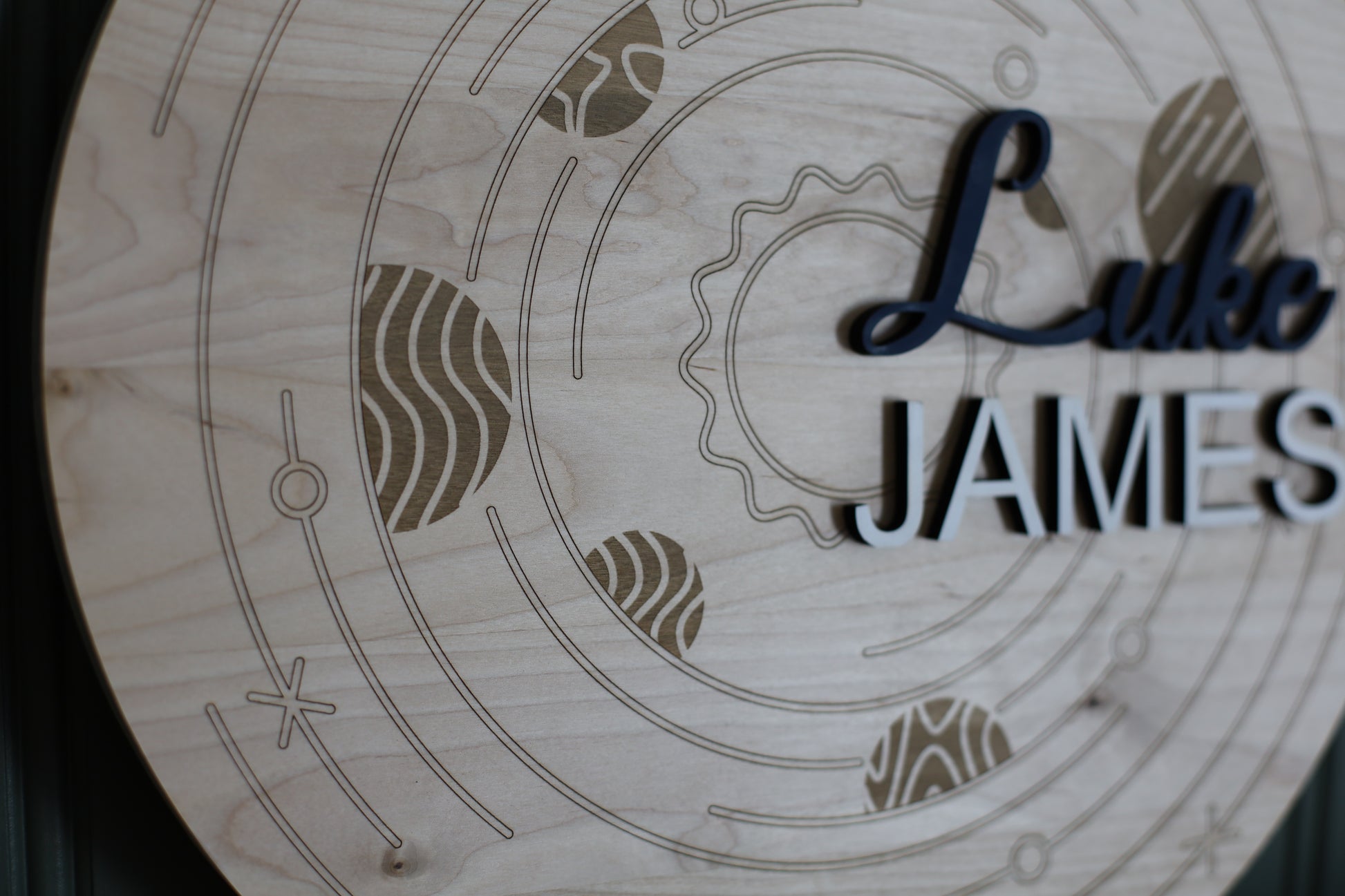 Add a touch of personalization to a child's bedroom or play area with a custom name sign. Made from high quality birch, this 16" round sign features a playful engraved solar system background and can be customized with your child's name. Perfect for creating a unique and special space for your little one!